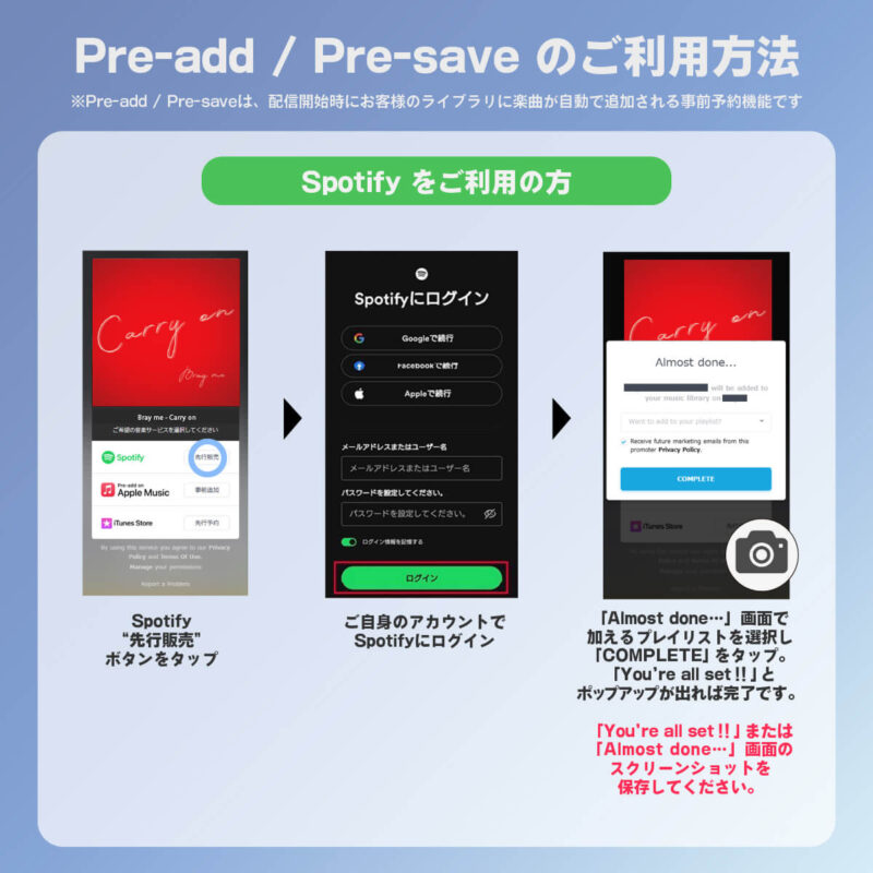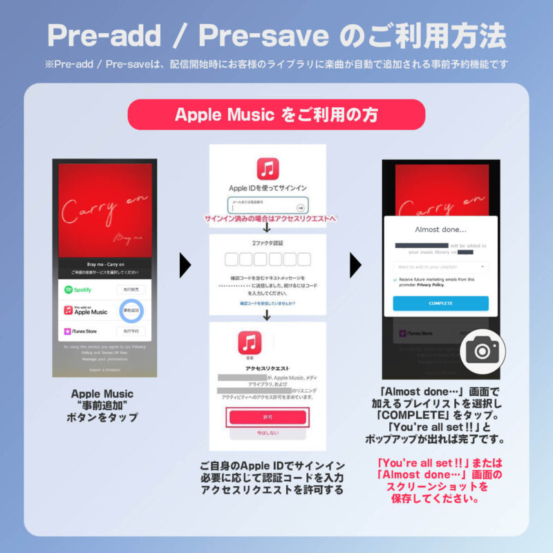 Apple MusicまたはSpotifyにて、10/15リリース「Carry on」の事前予約をして頂いた方全員に《スペシャル画像》をプレゼント!